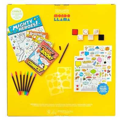 - Comes with markers, wood stamps and stamp pads, stickers, stencils, 2 soft cover comic books and 1 hardcover comic book